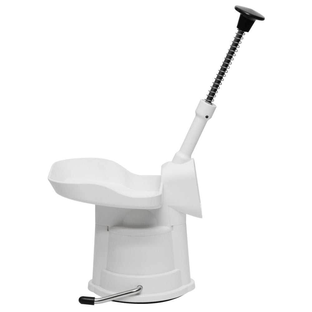 The Orchard Cherry Pitter handles up to 30 pounds of cherries per hour. Feeds and separates pits from fruits with little loss of juices. It efficiently feeds cherries from the tray into the chute. A simple push of the plunger effortlessly removes the pit from the cherry. The pits are ejected into a clear pit container and the cherries roll into an awaiting bowl. The strong suction base attaches to any smooth, non-prous surface, keeping the Cherry Stoner in place for hours of use. It also allows it to be used in even the most cramped of spaces, taking up very little counter space.