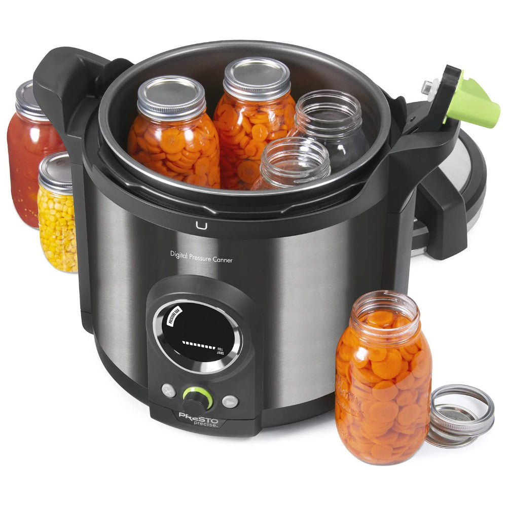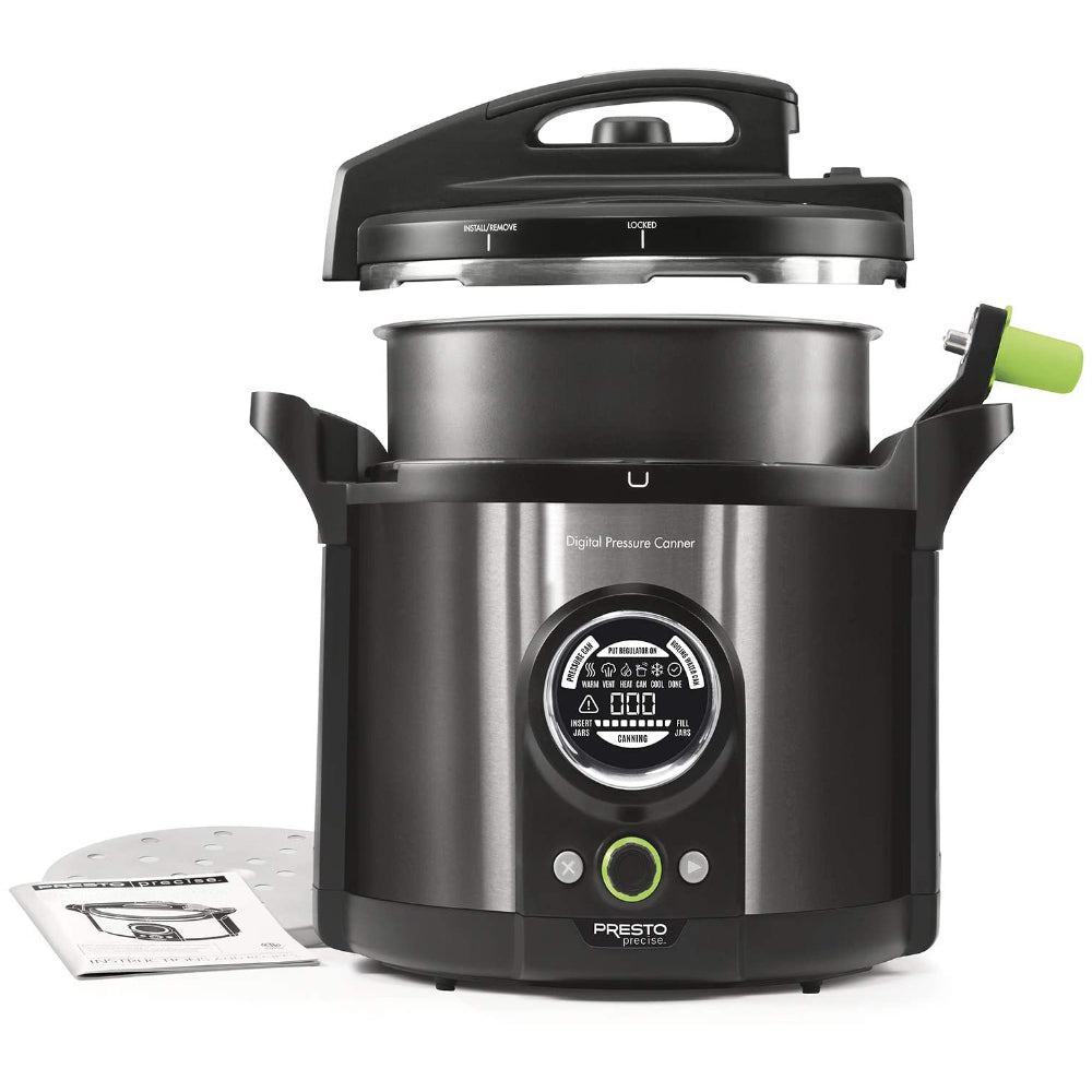The first digital pressure canner that meets USDA home canning guidelines for safely processing meats, poultry, fish, vegetables, and other low acid foods. Innovative sensor holds the exact temperature required for safe pressure canning. No adjustments needed, even for pressure canning at high altitudes. Easy-to-use digital display guides you through each step of the canning process. Built-in timer assures accurate, reliable processing. Doubles as a boiling water canner for preserving fruits, jams, jellies, pickles, and salsa. Preheats canning jars and keeps them hot until filled and ready to process. Cool and energy efficient. Holds heat inside the canner keeping your kitchen cooler. More efficient than processing on a high wattage burner or gas stove. Plus canned foods are shelf stable, saving freezer space and the energy required by freezers. Just place jars in the pantry until ready to use. Complete instruction/recipe book contains easy-to-follow procedures and recipes using standard processing times in accordance with USDA guidelines. Also includes an easy-to-reference Quickstart Guide. Ten built-in safety features including a cover locking system and an alert symbol that indicates an incomplete canning process.