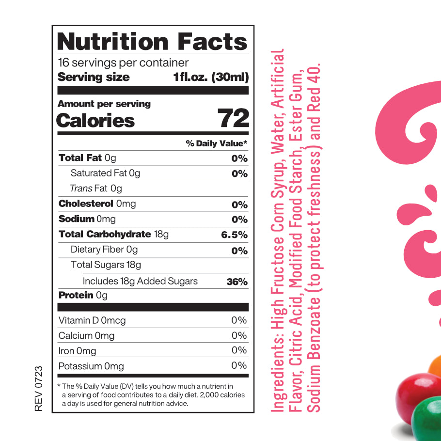 - High Fructose Corn Syrup, Water, Artificial Flavor, Citric Acid, Modified Food Starch, Ester Gum, Sodium Benzoate (to protect freshness) and Red 40.