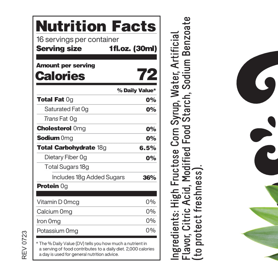 - High Fructose Corn Syrup, Water, Artificial Flavor, Citric Acid, Modified Food Starch, Sodium Benzoate (to protect freshness).