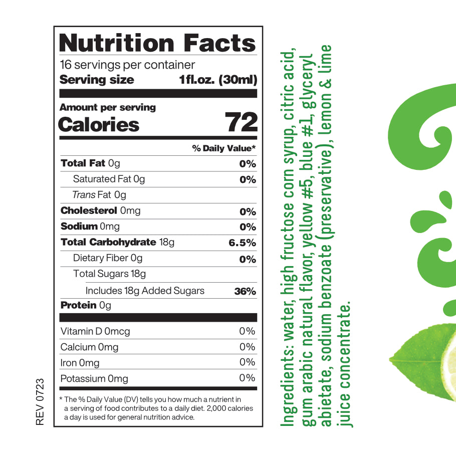 - water, high fructose corn sweetener, citric acid, gum arabic and/or modified food starch, natural flavor, yellow #5, blue #1, glyceryl abietate, sodium benzoate (preservative), lemon & lime juice concentrate.