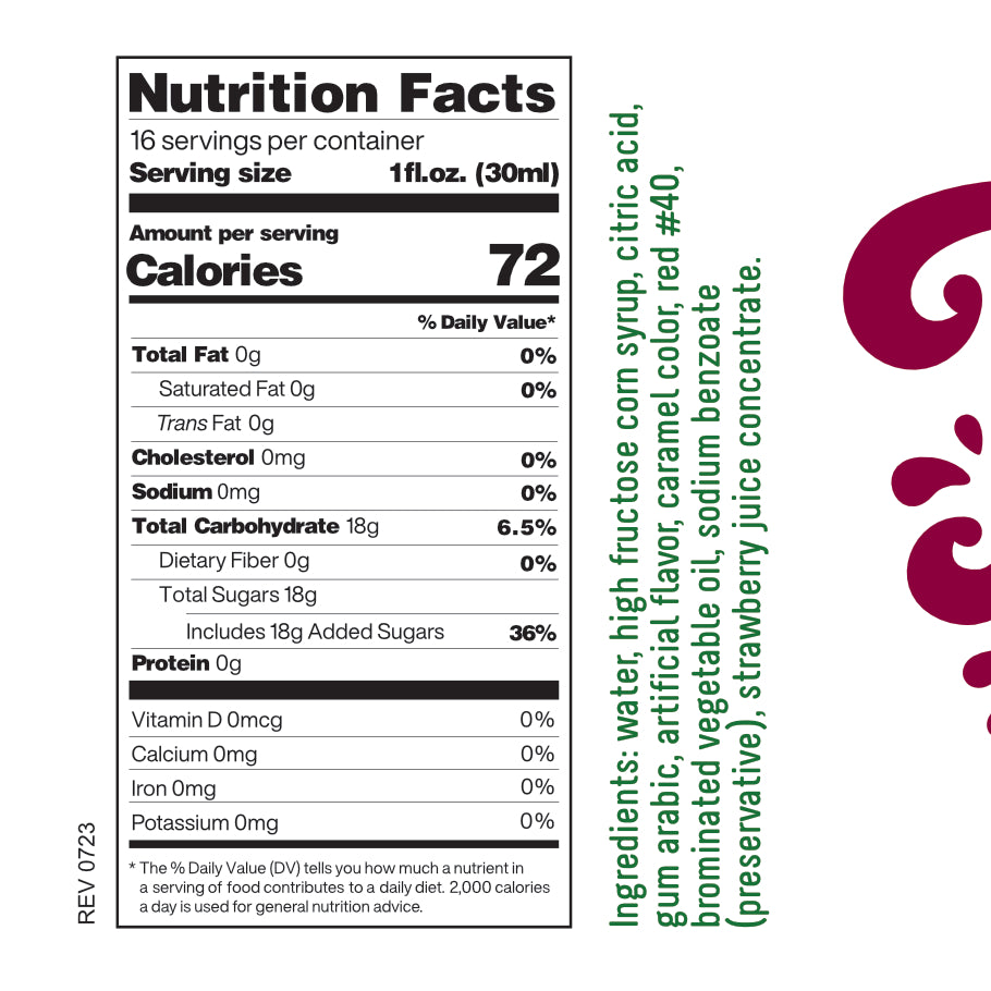 - high fructose corn sweetener, water, citric acid, gum arabic, artificial flavor, caramel color, red #40, brominated vegetable oil, sodium benzoate (preservative), strawberry juice concentrate.