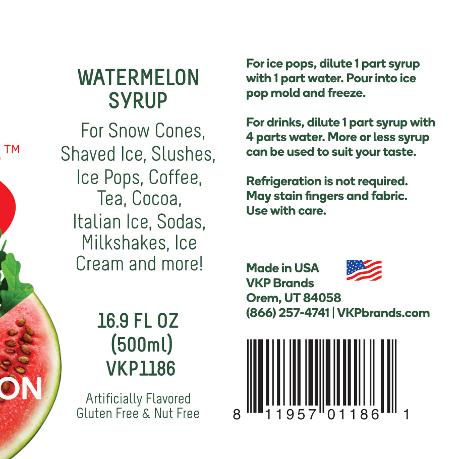 This is a premium shaved ice syrup that can be used for snow cones, slushes, ice pops, shakes, smoothies, homemade sodas and more. Comes with a squeeze top for easy pouring. The syrup will keep for several years unopened, as long as it is stored away from sunlight and temperatures above 80°F.