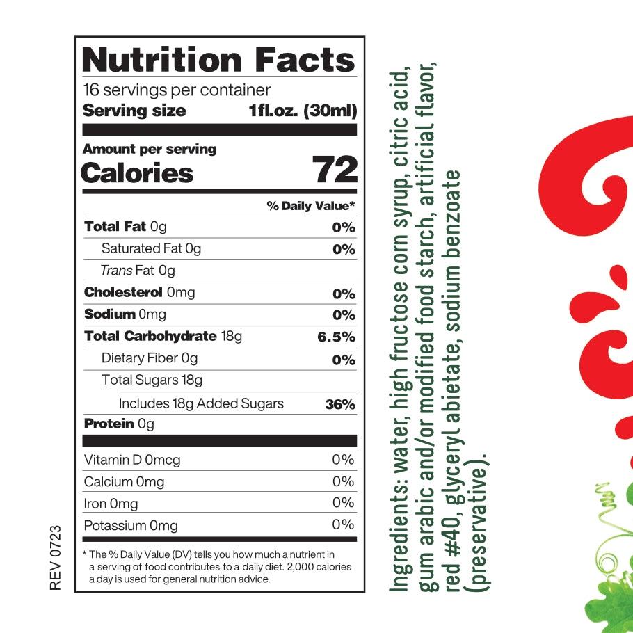 - water, high fructose corn sweetener, citric acid, gum arabic and/or modified food starch, artificial flavor, red #40, glyceryl abietate, sodium benzoate (preservative).