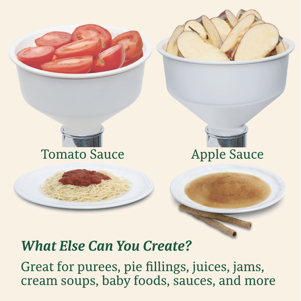 For any cook who wants to take the hassle out of homemade products like jams, purees and sauces, the Johnny Apple Sauce Maker is the perfect solution. Simplify tasks like making apple or tomato sauce. Put the fruits or vegetables in the hopper, turn the handle, and let the strainer do the work for you. The stainless steel screen effortlessly separates the skins and seeds from the fresh pulp. With our accessory screens and electric motor, the versatility is endless (Accessory Screens and Electric Motor sold separately).-